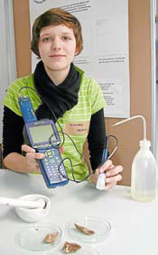 „Auf den Weichspüler-Versuch hat mich meine Mutter gebracht“, sagt die 16-jährige Alexa Fechtel. „Sie war bislang der Meinung, dass man Handtücher am besten ohne Weichspüler wäscht, weil sonst ihre Wasseraufnahmefähigkeit nachlässt.“ Nichts als eine Mär, wie die Versuche der Tochter im Rahmen von „Jugend forscht“ ergaben: „Ob man Weichspüler benutzt oder nicht, hat nahezu keinen Einfluss auf die Saugkraft von Textilien.“ Dass Kartoffeln Nitrat enthalten, das im Körper zu Nitrosamin umgewandelt wird, ist bekannt. Doch obwohl dieser Stoff verdächtigt wird, das Krebswachstum zu fördern, besteht keine akute Gefahr. „Man darf ruhig weiterhin Kartoffeln essen“, sagt der 15-jährige Jan Goldberg. „Denn der Nitratgehalt in Kartoffeln ist viel zu gering, um gefährlich werden zu können.“ Wer voll und ganz auf Nummer sicher gehen will, sollte zu Biokartoffeln greifen oder Erdäpfel essen, die schon leicht auskeimen, rät der Realschüler. „Bei ihnen ist der Nitratgehalt besonders niedrig.“ Rind- und Schweinefleisch von verschiedenen Herstellern hat Christin Hesker (15) auf Haltbarkeit, PH-Wert und Trockenmasse hin untersucht. Ihr Fazit: „Das beste Fleisch gibt es immer noch vom Metzger nebenan.“ Mit der Qualität könne die Discount-Ware oft nicht mithalten. Mit der Wirkung von Kariesschutz- Cremes beschäftigten sich Fritz Falkenreck und Matthias Gunter. Dazu tauchten sie Eier, deren Schalen zuvor mit den Gels eingerieben worden waren, in aggressive Essigsäure. „Am besten gewirkt hat die ,Elmex‘-Creme für sieben Euro“, sagt Matthias Gunter. „Bei dem doppelt so teuren Konkurrenzprodukt wurde die Eierschale bereits nach vergleichsweise kurzer Zeit vom Essig angegriffen.“ Frederick Neß (15) hat die Auswirkungen der Gravitationskraft auf junge Bohnen erforscht, Sebastian Heinzelmann ein solarbetriebenes Trike samt Ladestation und Sonnenstrom-Tankstelle entwickelt. „Mit dem motorisierten Dreirad kann man große Entfernungen zurücklegen, ohne klimaschädliches Kohlenstoffdioxid zu produzieren.“