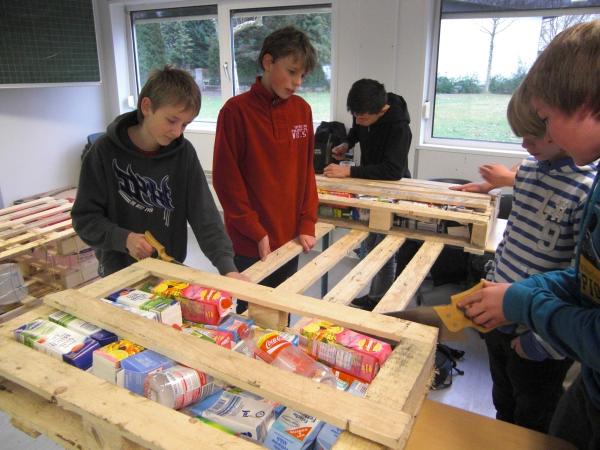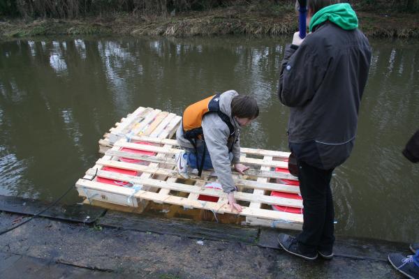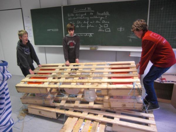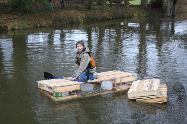 Dazu gibt es die Survival AG. Werden im fünften und sechsten Schuljahr zunächst Grundfertigkeiten geübt, wie etwa in Erster Hilfe für Kinder, einigen Improvisationstechniken oder dem Feuermachen, so wird es im siebten und achten Schuljahr schon anspruchsvoller. Für die Großen galt es mit Hilfe eines selbst gebauten Floßes die Ems zu überqueren. Das Floß durfte nur aus kostenlosem Baumaterial hergestellt werden, was die Sache anspruchsvoller machte. Mitte Dezember war es dann soweit: Das Floß musste beweisen, was es konnte. Ein mutiger Testpilot war schnell gefunden. Wie das Ganze aussah könnt ihr auf den Fotos sehen.