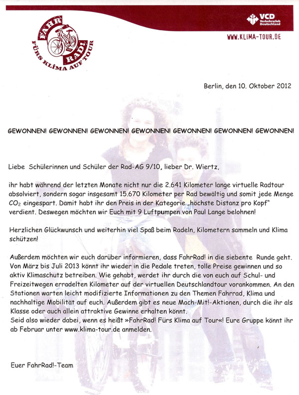 Aufgerufen zu dieser Aktion hatte der ökologische Verkehrsclub VCD. Bei der Preisverleihung am Mittwoch hob Bernd Küffner (VCD Ostwestfalen-Lippe) die sportliche Leistung und das klimafreundliche Engagement der Schüler hervor. Die Osterrath-Realschule nahm bereits zum vierten Mal äußerst erfolgreich an dem Wettbewerb teil. Nach dem Gewinn der Kategorie „Höchste zurückgelegte Distanz pro Kopf“ 2009 und dem zweiten Platz in der Gesamtkilometerleistung 2010, hatte die Rad-AG im letzten Jahr sogar den Hauptpreis gewonnen.