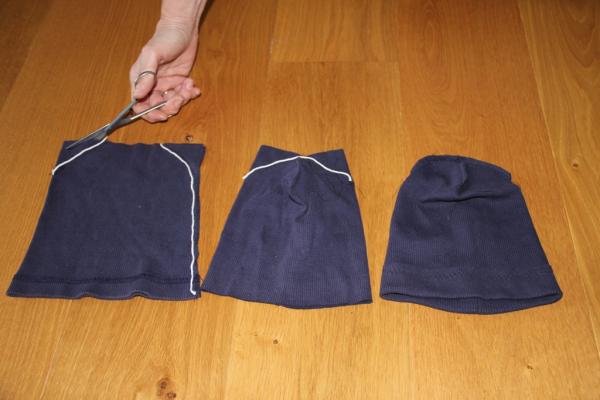 - Zusammenklappen und die Mütze im Stretchstich und Kugelkopfnadel zunähen.