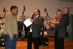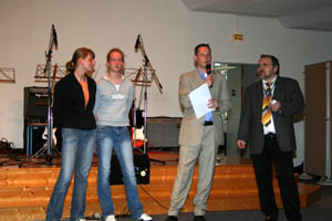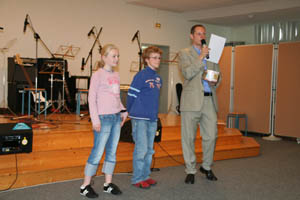 Bei dem 2. Ehrungsblock wurden mit dem FOR-Ehrenpreis die Tutoren der Hausaufgabenbetreuung (stellvertretend Christoph B. + und Marietta K.), Angela Ö. für ihr jahrelanges Engagement in der Theater- AG und das Team "Who is Who" (Nicole B. + Pia D.), die die ganzen Bilder für die "Who is Who-Vitrine" erstellt haben geehrt. Ebenfalls wurde ein Vater unserer Schüler, Herr Kamin, der die Vitrinen zusammengebaut und das ganze Material zur Verfügung gestellt hat sowie unseren Technikunterricht schon lange mit Material unterstützt, geehrt. Er durfte sich über einen riesigen Präsentkorb freuen.