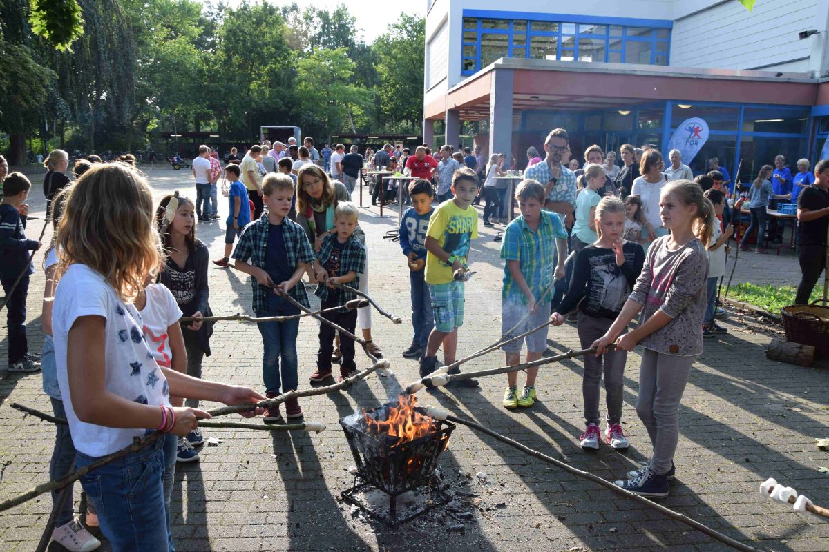 Dies sind einige besondere Eindrücke vom Jahresfest des Fördervereins der Osterrath-Realschule. Über 300 Eltern und Kinder der Klassen 5 und 6 waren gekommen, sie brachten 78 Salate mit für ein tolles buntes Büffet. Bratwürstchen und Getränke gab es vom Förderverein und den Teig für das Stockbrot hatte die Bäckerei Vorbohle gespendet. Die Survival-AG der Schule entfachte – trotz der Sommerhitze – ein großes Lagerfeuer an dem das Stockbrot und Marshmallows von den Kindern an langen Stöcken geröstet wurde.