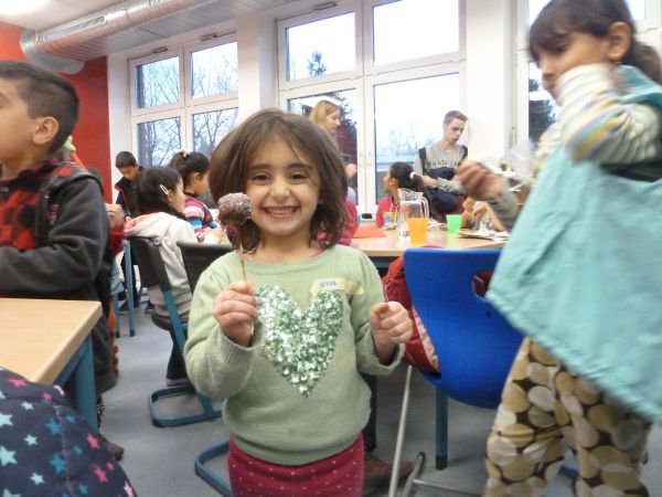 So kamen kleine Menschen aus Syrien, dem Irak und Afghanistan erwartungsvoll in die Realschule am Burgweg. Hier bereiteten ihnen die deutschen Jugendlichen mit großem Engagement ein paar schöne, unbeschwerte und für beide Seiten beglückende Stunden. Sprachliche Barrieren wurden schnell überwunden. Beim Fußballspielen, Backen, Basteln und Spielen kam man sich schnell näher. Nach anfänglichen Berührungsängsten, dauerte es nicht lange und überall war glückliches Lachen der Kinder zu hören.