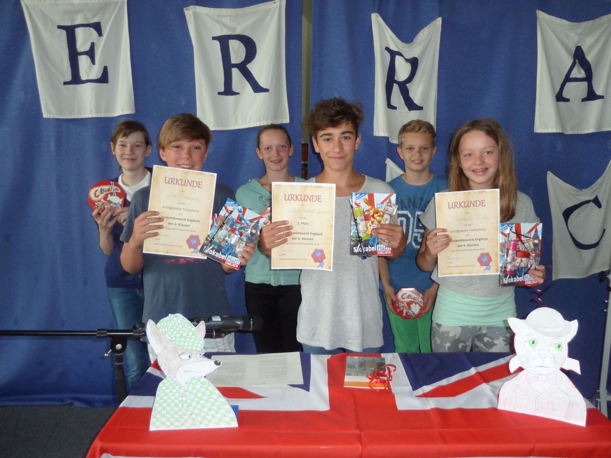 Pharos, der Lieblingshund der Königin, wendet sich an die Detektive Sir Fox Bones und Dr Catson. Wie der Fall ausgeht, haben die Schüler und Schülerinnen beim Englisch Vorlesewettbewerb der 6. Klassen am 05.07.16 nicht erfahren. Schließlich ging es darum, den besten Leser des Jahrgangs 6 zu ermitteln. Hierbei achtete die Jury bestehend aus Frau Franke, Frau Heitmann und Frau Zimmermann auf verschiedene Kriterien wie Sprachrichtigkeit, Aussprache, Betonung, Deutlichkeit und Tempo. Die zuvor in den Klassen ermittelten Klassensieger Noah Gabriel Berndt (6a), Marc Buzuinski (6b) und Franziska Fischer (6c) mussten dafür in der Aula vor ihren Klassenkameraden die ersten Seiten der Lektüre „Sir Fox Bones and the Buckingham Palace Mystery“ lesen. Sieger wurde schließlich Noah und wurde dafür mit der Lektüre belohnt.