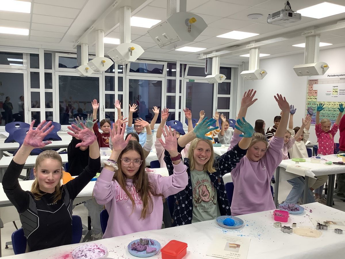 In der Woche vor den Herbstferien nahmen daher 20 Mädchen aus den Jahrgängen 6-9 an der ersten MINT-Mädchen-Nacht teil. Bevor es allerdings so richtig losging, zeigte Frau Schorr zunächst experimentell, wie Seife hergestellt wird. Als Ersatz für diese Rohseife, die nach der Herstellung erst einmal mehrere Tage trocknen muss, bekamen die Mädchen fertige Kernseifen. Diese wurden eifrig gerieben und geraspelt, bis feine Seifenflocken entstanden. Danach durfte nach eigenem Belieben mit Lebensmittelfarbe und Düften von Bratapfel, Lavendel und Vanille geknetet und mit Händen oder Ausstechern geformt werden. Zum Schluss veredelten die Mädchen ihre Seifen mit Blüten von Kamille, Lavendel oder Teeblättern. Der Abend machte nicht nur den Teilnehmerinnen viel Spaß, auch Frau Michaelis und Frau Dittrich-Borgmeier als weitere MINT-Lehrerinnen freuten sich über den Einsatz und das Interesse an dieser gelungenen MINT-Nacht für Mädchen. Eine Wiederholung ist daher fest eingeplant.