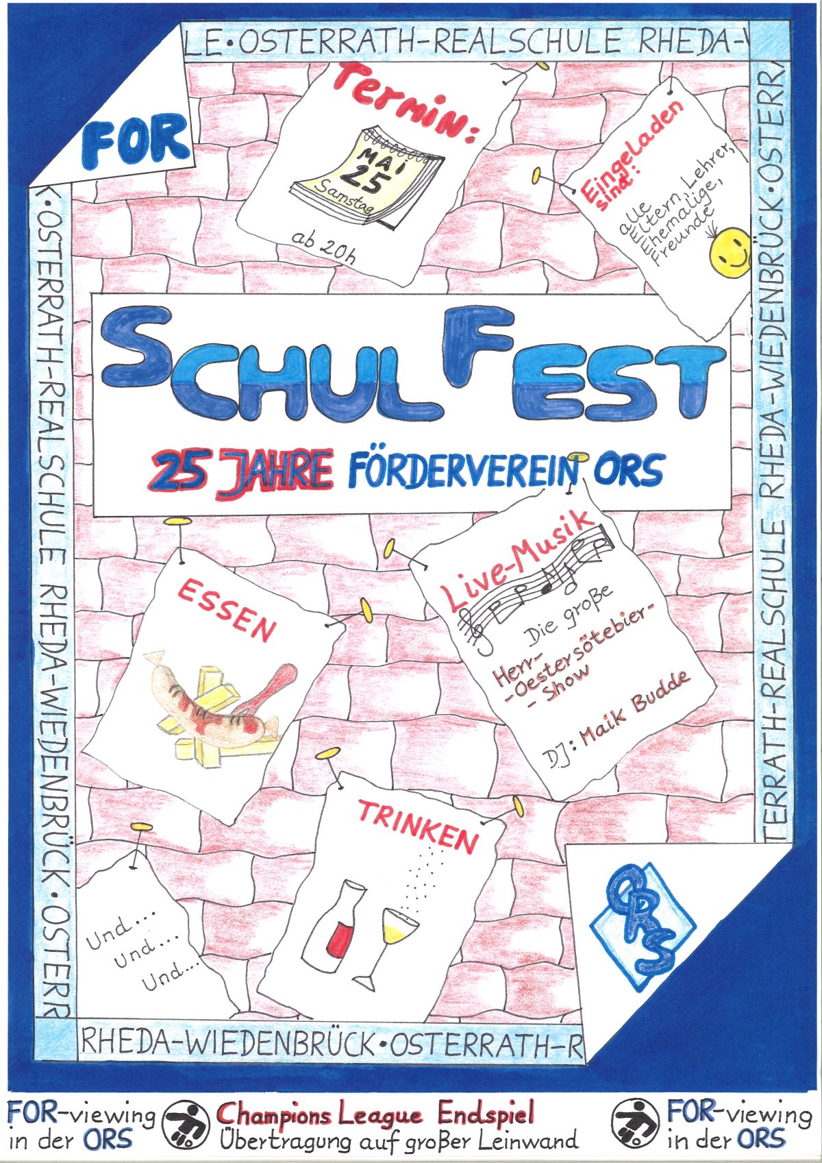 Ab 20.00 Uhr sind alle Erwachsenen herzlichst eingeladen in die Mensa der Schule. Live-Musik und ein DJ laden zum Tanzbeinschwingen ein, die Getränkebars und eine Würstchenbude sollen die Gäste zum Schlemmen einladen und auch an die Fußballfreunde wird gedacht - „Rudelgucken“ zum Champions-League-Finale im Eingangsbereich der Schule.
