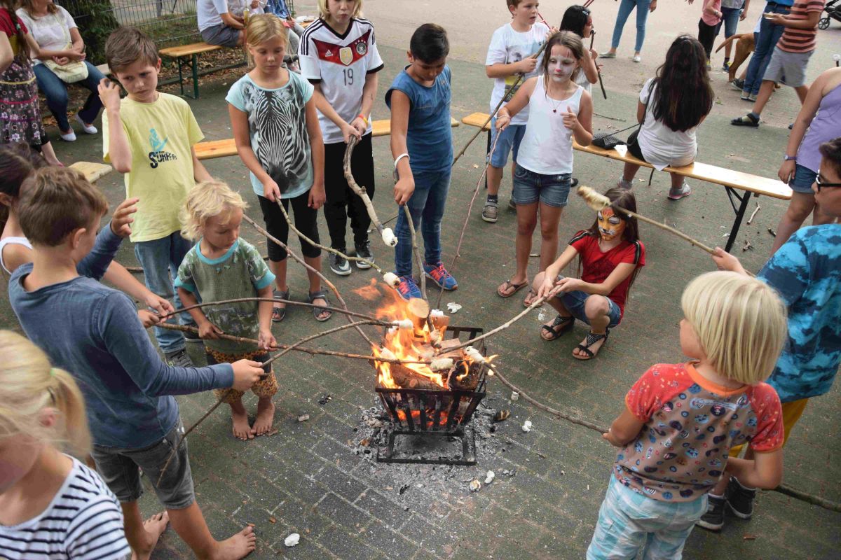 Strahlender Sonnenschein, fröhliches Kinderlachen, der Duft von Stockbrot und Bratwürstchen, dies sind einige Eindrücke vom Sommerfest des Fördervereins der Osterrath-Realschule. Über 450 Eltern und Kinder der Klassen 5 und 6 waren gekommen, sowie die Kinder und Eltern der beiden internationalen Klassen, die alle gemeinsam ein schönes Fest feiern wollten. Mitgebracht wurden 90 Salate für ein tolles buntes Büffet. Bratwürstchen wurden professionell vom Partyservice Knöbel gegrillt, Getränke gab es vom Förderverein und den Teig für das Stockbrot hatte die Bäckerei Vorbohle gespendet. Die Survival-AG der Schule entfachte – trotz der Sommerhitze – ein großes Lagerfeuer an dem Stockbrot und Marshmallows von den Kindern an langen Stöcken geröstet wurde.