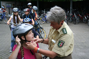 Nach diesen beeindruckenden Schilderungen erhielten die Fahrrad-Schüler des 5. Jahrgangs innerhalb eines aufgebauten Parcours auf dem Schulhof ein Training zum verkehrssicheren Verhalten mit dem Fahrrad. Diesen praktischen Übungen waren die exakte Helmeinstellung, das Ausstatten der Helme mit Reflektoren sowie die Betriebs- und Verkehrssicherheit der Fahrräder durch Polizisten der örtlichen Wache voran gestellt. Staunend begutachteten die Schüler dabei die Unterstützung des Mechanikers Jörg Faimann vom Radteam der 3C Gruppe, der vor Ort leichte Defekte sachgerecht und in Windeseile behob.