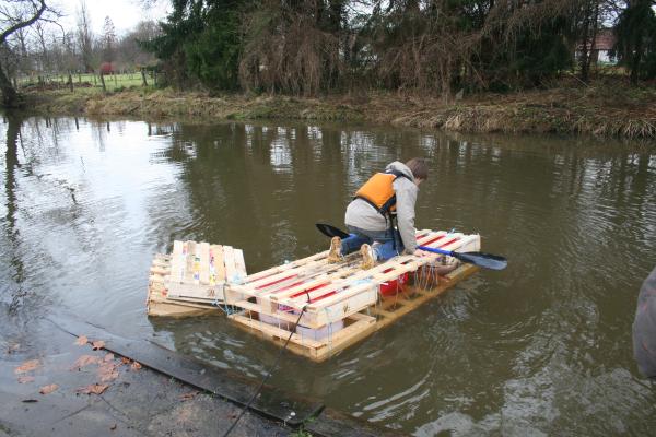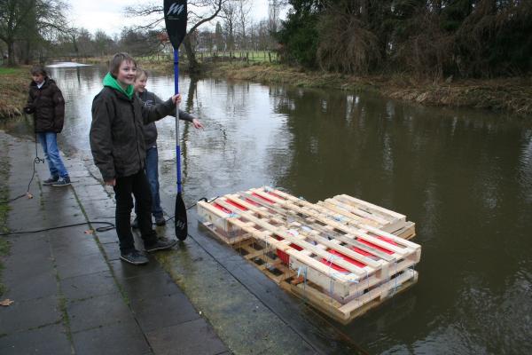 Dazu gibt es die Survival AG. Werden im fünften und sechsten Schuljahr zunächst Grundfertigkeiten geübt, wie etwa in Erster Hilfe für Kinder, einigen Improvisationstechniken oder dem Feuermachen, so wird es im siebten und achten Schuljahr schon anspruchsvoller. Für die Großen galt es mit Hilfe eines selbst gebauten Floßes die Ems zu überqueren. Das Floß durfte nur aus kostenlosem Baumaterial hergestellt werden, was die Sache anspruchsvoller machte. Mitte Dezember war es dann soweit: Das Floß musste beweisen, was es konnte. Ein mutiger Testpilot war schnell gefunden. Wie das Ganze aussah könnt ihr auf den Fotos sehen.