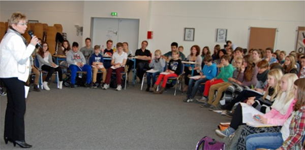 Alle Fragen wurden mit großer Geduld beantwortet, bis Schulleiter Detlef Flasche bemerkte: "Die Schüler sind jetzt platt!" Zum Dank wurden der Präsidentin schuleigene Schokolade und Kaffeetassenuntersetzer mit ORS-Logo überreicht.