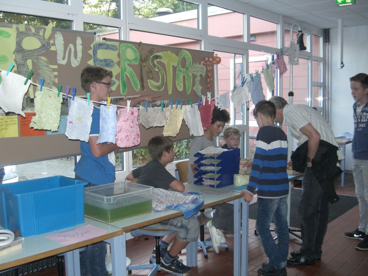 Die knapp 630 Schülerinnen und Schüler der Osterrath-Realschule erlebten vom 29.09. bis zum 01.10.2014 Unterricht ganz anders: In 27 unterschiedlichen Workshops konnten sie klassen- und jahrgangsübergreifend neue Lernerfahrungen sammeln. „Freundschaftsbänder“, „Clever konsumieren“, „Wir zeigen Flagge – Schule gegen Rassismus“ oder die „Papierwerkstatt“ sind nur einige der Angebote, zu denen an diesen Tagen gearbeitet wurde. Die Lehrkräfte hatten im Vorfeld des Projektes vielfach Teams gebildet und Konzepte zu Themen entwickelt, die ihnen besonders am Herzen lagen. Die normalen Unterrichtszeiten wurden aufgehoben, Pausen dann gemacht, wenn es sich im Arbeitsprozess anbot.