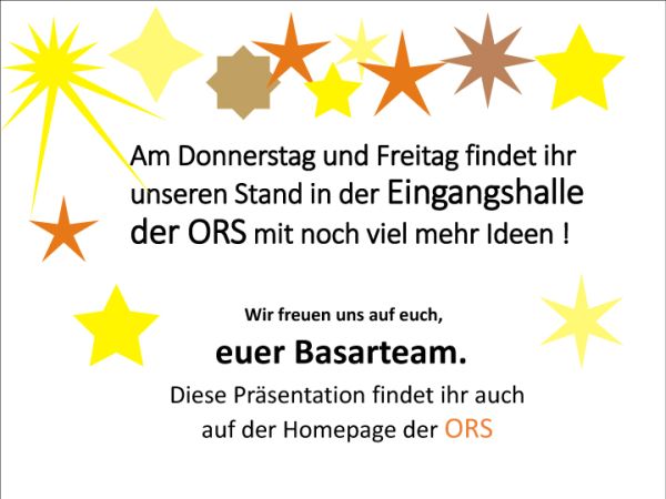 In gemütlicher Atmosphäre bieten wir selbstgemachte Dinge an, die Sie selbst benutzen oder auch verschenken können.Sie haben Zeit zum Stöbern und Kaufen am Donnerstag, den 27.11.2014 von 7.45 Uhr - 19.00 Uhr und Freitag, den 28.11.2014 von 7.45 Uhr - 13.00 Uhr. Bestimmt gibt es wieder neue Dinge zu entdecken. Wie bereits in den letzten Jahren findet der Weihnachtsbasar in der Eingangshalle der Osterrath - Realschule am Burgweg in Rheda-Wiedenbrück statt. Es lohnt sich zu kommen. Wir freuen uns auf ihren Besuch.