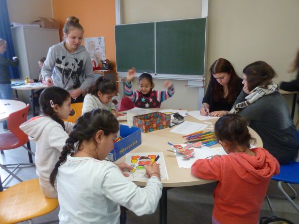 So kamen kleine Menschen aus Syrien, dem Irak und Afghanistan erwartungsvoll in die Realschule am Burgweg. Hier bereiteten ihnen die deutschen Jugendlichen mit großem Engagement ein paar schöne, unbeschwerte und für beide Seiten beglückende Stunden. Sprachliche Barrieren wurden schnell überwunden. Beim Fußballspielen, Backen, Basteln und Spielen kam man sich schnell näher. Nach anfänglichen Berührungsängsten, dauerte es nicht lange und überall war glückliches Lachen der Kinder zu hören.