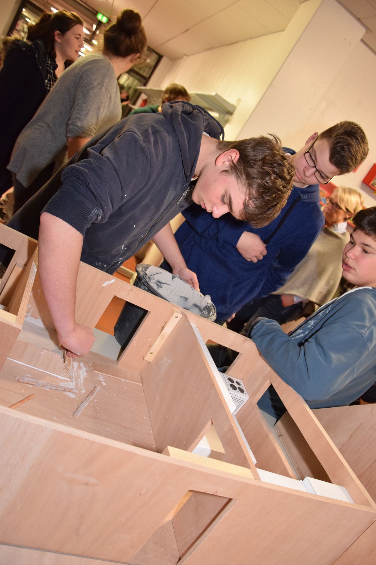 Die Schüler Matteo Duhme, Dominik Kleinelümern und Lukas Witte errichten vor den Augen der zahlreichen Gäste das Modell eines Wohnhauses
