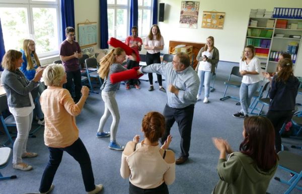 Die umfangreiche Qualifizierung, deren Ziel die Erhaltung eines guten Schulklimas ist, hatte Schwerpunkte in den Grundlagen der Gesprächsführung und zivilcouragierten Handelns, vermittelte den Schülern Kenntnisse über Mobbing und Möglichkeiten des Einschreitens sowie ein breit angelegtes Kompetenztraining zur Übernahme von Patenklassen. „Ein Top-Team, das durch die Ausbildung für viele Themen sensibilisiert ist und unseren Schullalltag bereichern wird“, sind sich nicht nur die begleitenden Lehrerinnen Renate Langner und Susanne Plaß sicher, sondern auch Schulleiter Detlef Flaschel. Bei der Zertifikatsübergabe konnte er sich einen Eindruck von den erworbenen Kompetenzen verschaffen. Zunächst nahm er aktiv am Spiel „Spaßkloppe“ teil, zur großen Freude der Schülerinnen und Schüler, war dann aber beim ernsthaften Auswertungsgespräch über die Rolle von Zuschauern bei Konflikten auf dem Schulhof über das Wissen der Schülercoaches sehr beeindruckt. Auch die 8.-Klässler selbst waren einhellig der Meinung: „Voll krass, was wir alles gelernt haben!“