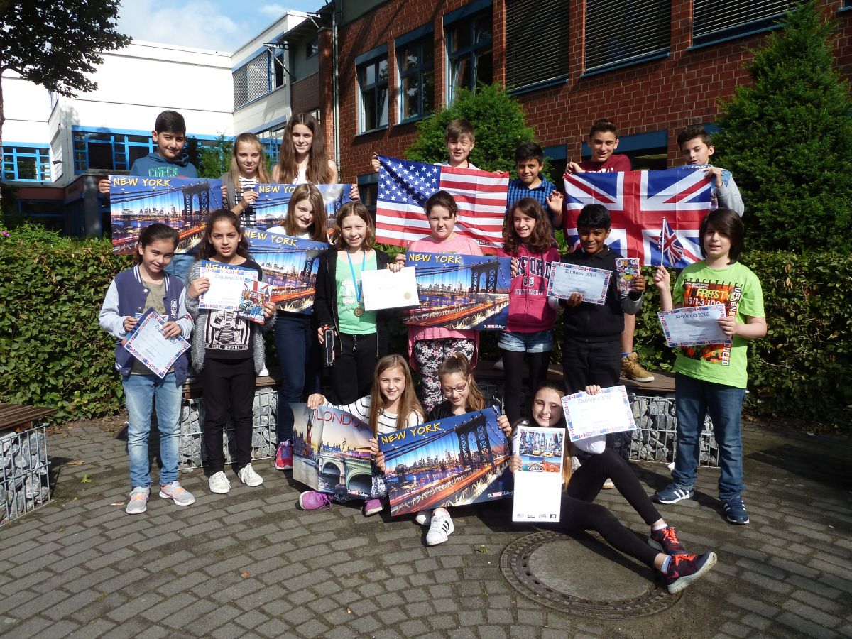 Und wie immer gab es tolle Preise zu gewinnen: Poster, UK- und USA-Flaggen, Bleistifte, Lektüren, Comics, Vokabelhefte, Schülerkalender und Wandkalender. Alle Teilnehmer bekamen eine Urkunde und einen Preis. Für die Jahrgangsbesten Maja Hülsei (5a), Lynn Heinrichsmeier (6b), Chantal Kondrat (7b), Antonia Gerke (8b) und Alana Lilian Tunnell (9d) gab es zusätzlich Selfie Sticks und eine Medaille.