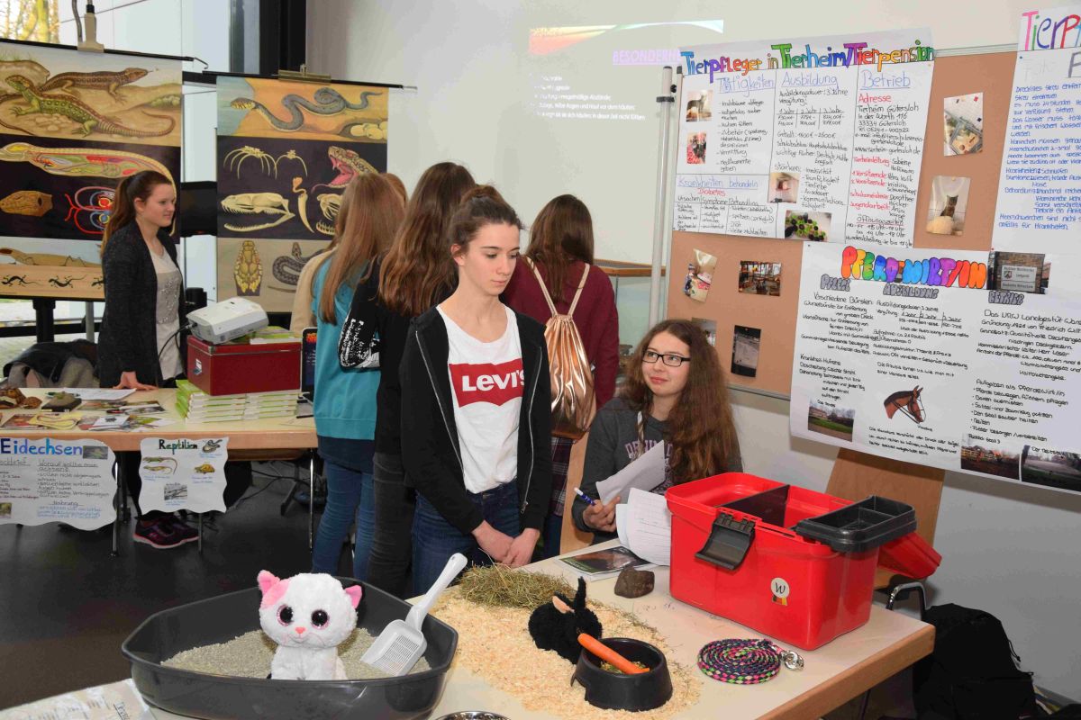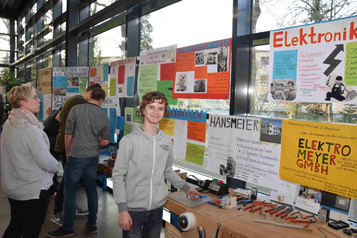 In lebendigen Werkstätten wurden zahlreiche Berufsfelder vorgestellt. Auch die Kooperationsfirmen Sudbrock Möbelhandwerk, Venjakob Maschinenbau, Westag & Getalit und die Tischler-Innung Gütersloh stellten sich auf der Berufsinformationsbörse vor. Unterstützt wurden sie von weiteren Betrieben, die ebenfalls die Osterrath-Realschule im Bereich der Berufsorientierung begleiten, sei es durch Bewerbungstrainings oder durch die Aufnahme von Praktikanten.
