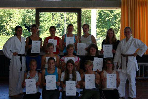 Über ihre bestandene Prüfung zum gelb-weißen Gürtel (9. Kyu) freuten sich Sarah Grundkötter, Marietta Kittner, Jana Rosenfeld (alle 9c), Karina Hollenbeck und Leoni Peterburs (beide 9e). Einen besonderen Erfolg konnten Ellen-Vanessa Brormann, Meike Bühlmeier, Anna Südbrock (alle 9b), Isabella Hiller (9c), Katharina Kuhn (9d), Marianne Subow und Judith Weck (beide 9e) verbuchen, die sogar die Prüfung zum gelben Gürtel (8. Kyu) erfolgreich absolvierten. Eine besonders gute Leistung wurde von Angela Ölscher (9d) gezeigt, der ebenfalls der 8. Kyu verliehen wurde.