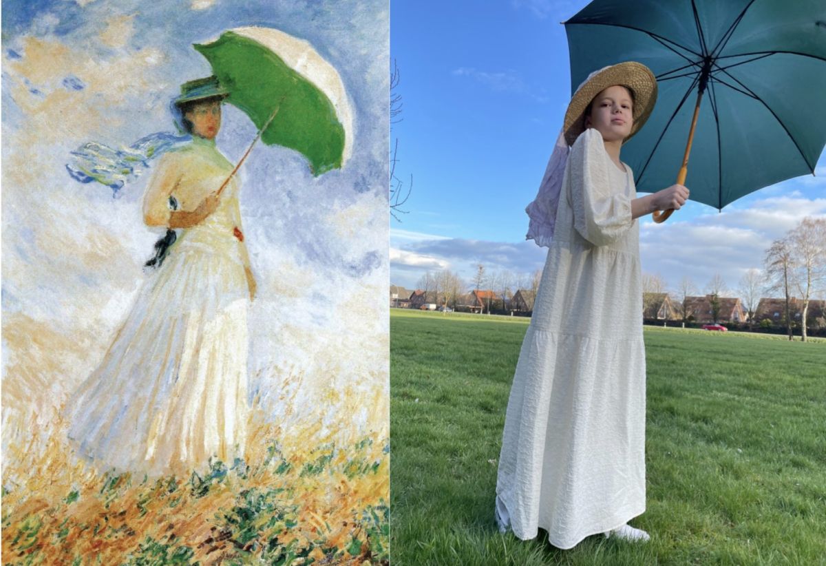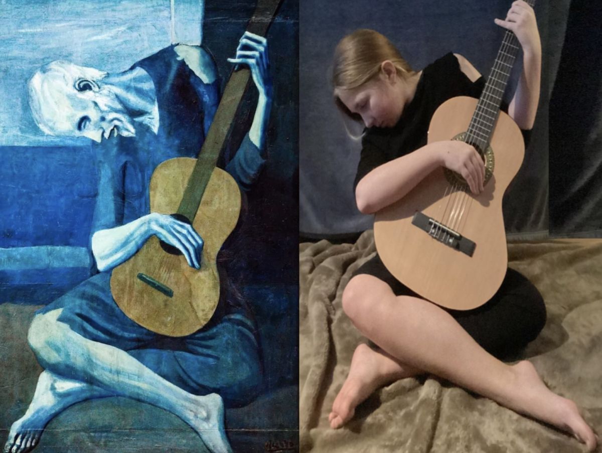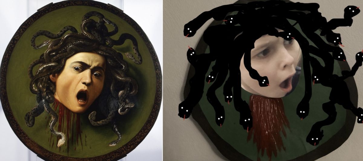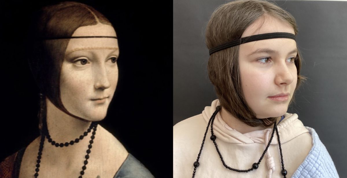 Das Getty Museum Los Angeles rief während des Lockdowns 2020 dazu auf, bekannte Kunstwerke mithilfe von Alltagsgegenständen nachzustellen und hochzuladen. Die Schülerinnen und Schüler verwendeten Mitgebrachtes und überarbeiteten ihre Fotos digital. Dabei übten sie sich in der bestmöglichen Imitation von Mimik und Gestik.