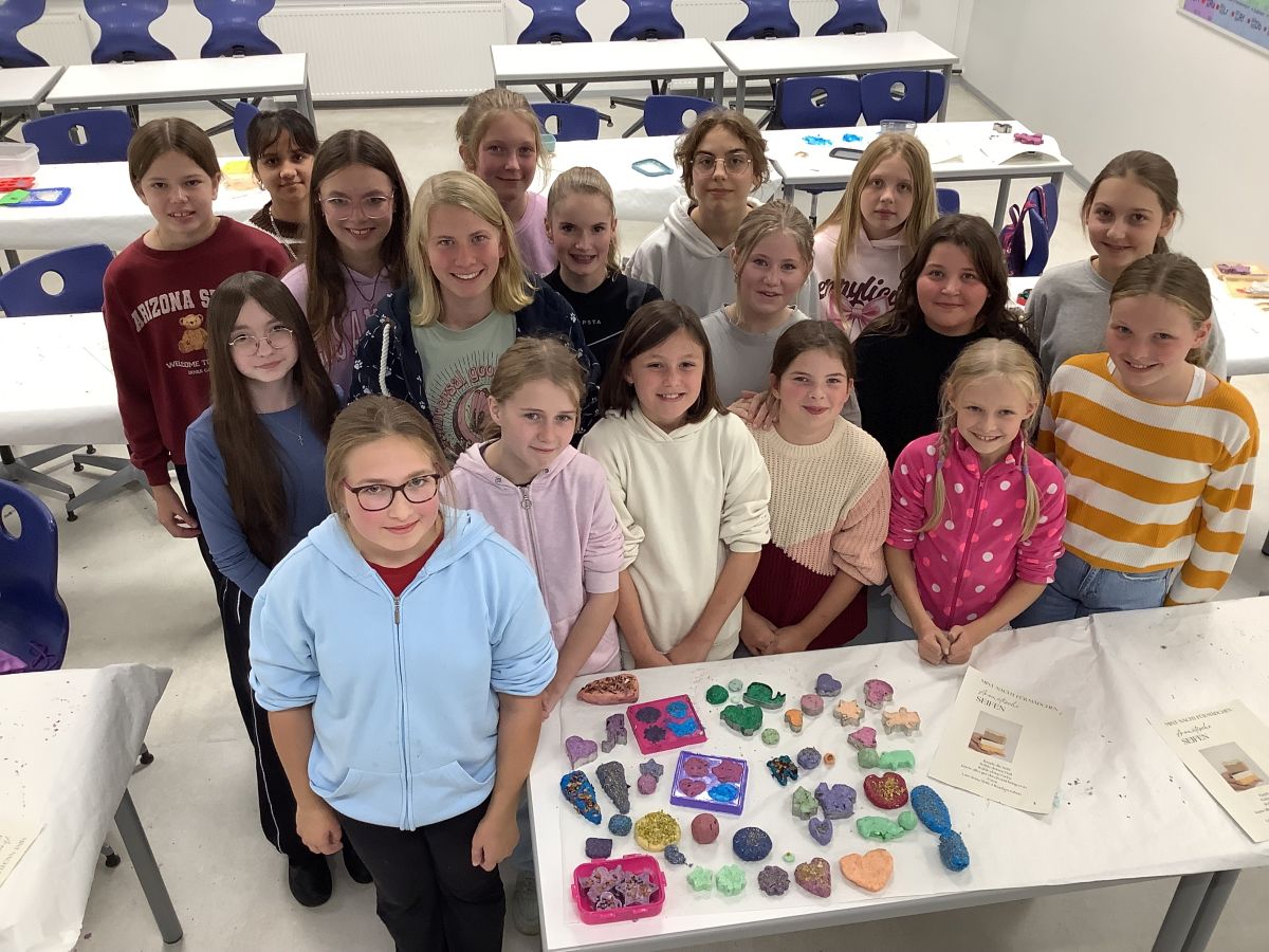 In der Woche vor den Herbstferien nahmen daher 20 Mädchen aus den Jahrgängen 6-9 an der ersten MINT-Mädchen-Nacht teil. Bevor es allerdings so richtig losging, zeigte Frau Schorr zunächst experimentell, wie Seife hergestellt wird. Als Ersatz für diese Rohseife, die nach der Herstellung erst einmal mehrere Tage trocknen muss, bekamen die Mädchen fertige Kernseifen. Diese wurden eifrig gerieben und geraspelt, bis feine Seifenflocken entstanden. Danach durfte nach eigenem Belieben mit Lebensmittelfarbe und Düften von Bratapfel, Lavendel und Vanille geknetet und mit Händen oder Ausstechern geformt werden. Zum Schluss veredelten die Mädchen ihre Seifen mit Blüten von Kamille, Lavendel oder Teeblättern. Der Abend machte nicht nur den Teilnehmerinnen viel Spaß, auch Frau Michaelis und Frau Dittrich-Borgmeier als weitere MINT-Lehrerinnen freuten sich über den Einsatz und das Interesse an dieser gelungenen MINT-Nacht für Mädchen. Eine Wiederholung ist daher fest eingeplant.